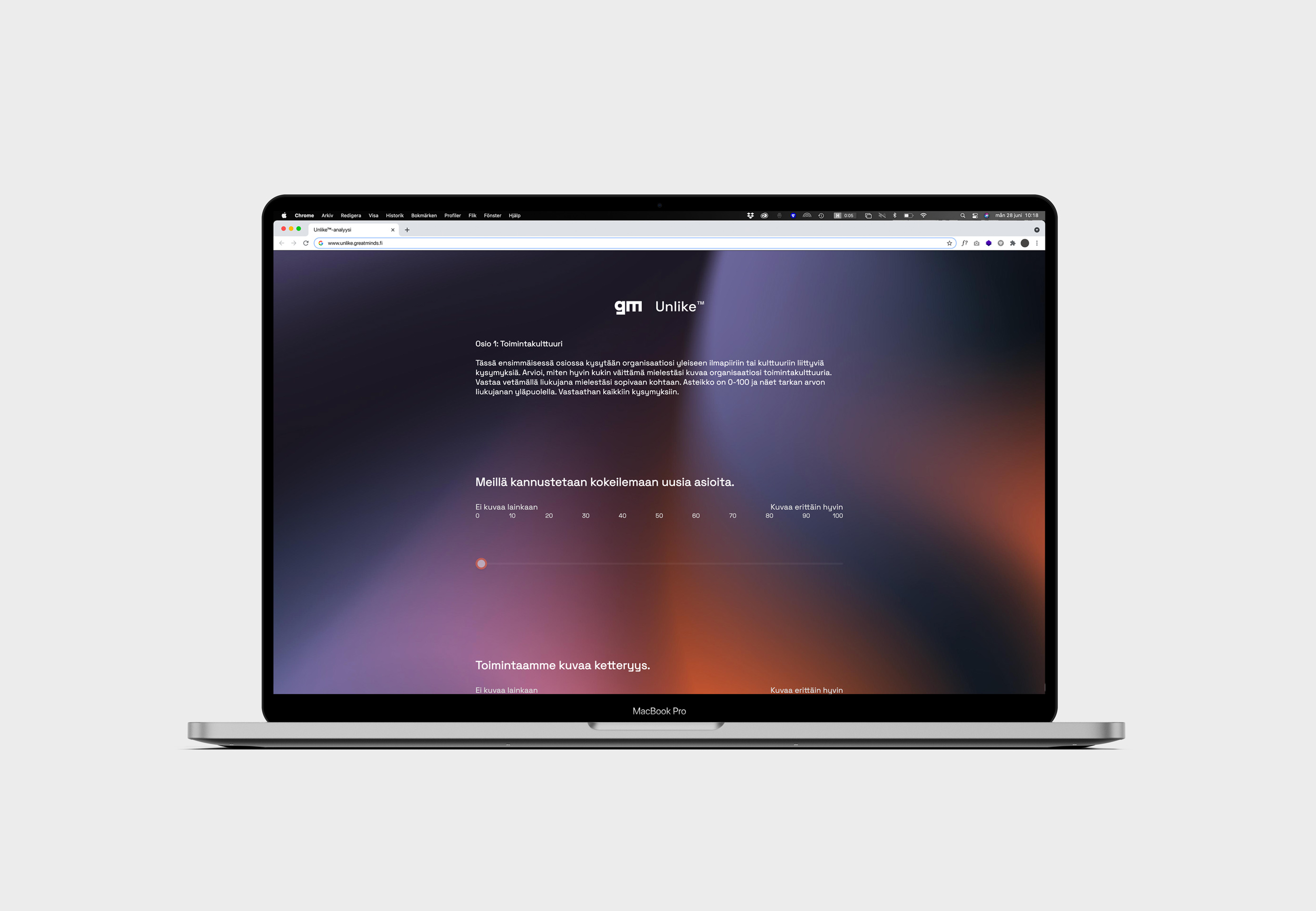 — Unlike® Auditin tuloksena yritys saa raportin, jossa eri osa-alueet käydään läpi yksityiskohtaisesti. Organisaatio saa 61 tunnusluvun lisäksi myös oman tulevaisuuskuntoisuusindeksin, joka antaa kokonaiskuvan tulevaisuuskuntoisuuden tasosta ja vertailukohtaa muihin organisaatioihin.